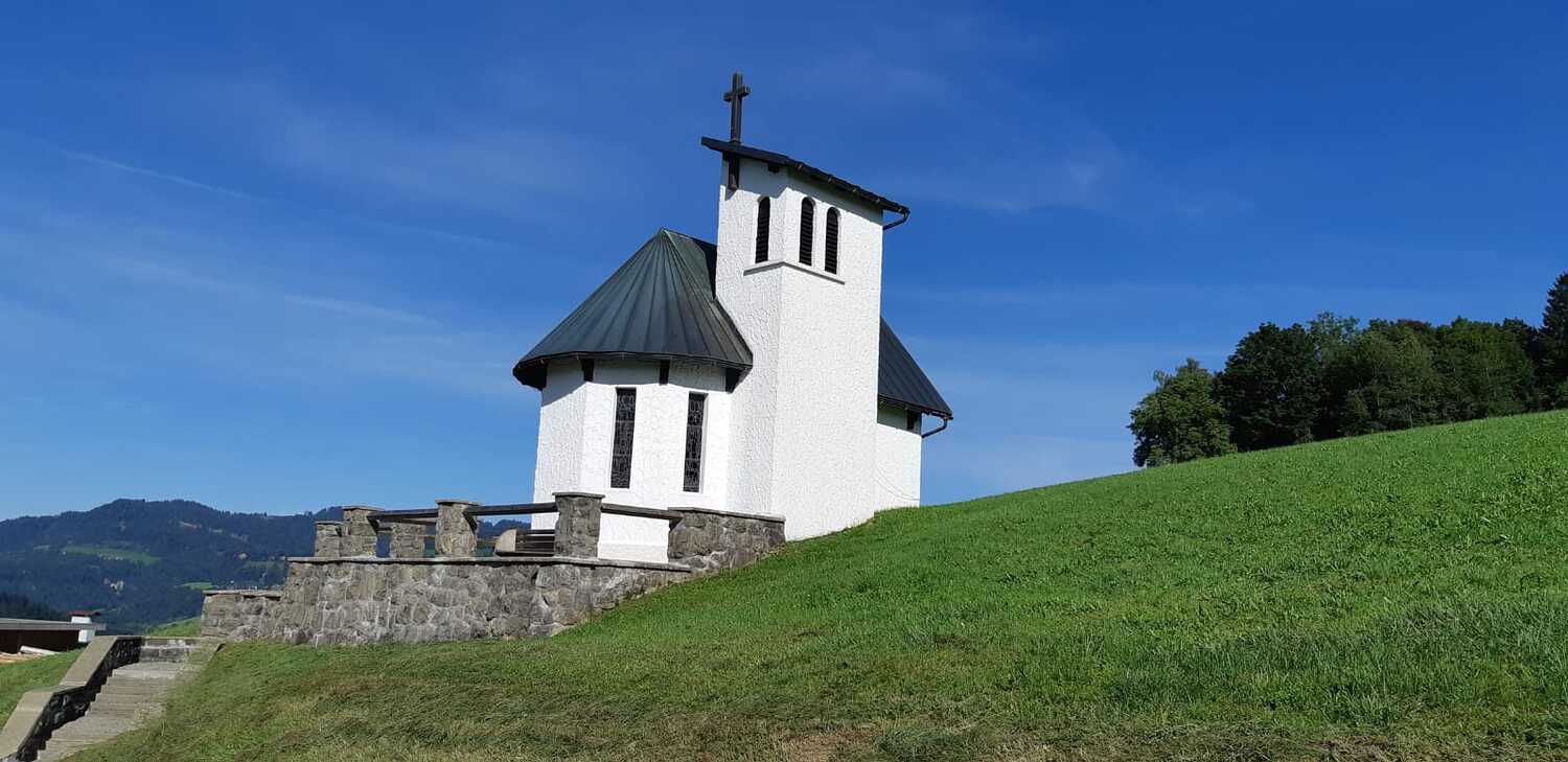 Die Heiligkreuzkapelle steht in der Parzelle Sulz, wo man einen herrlichem Blick in die Berge des Bregenzerwaldes genießen kann.