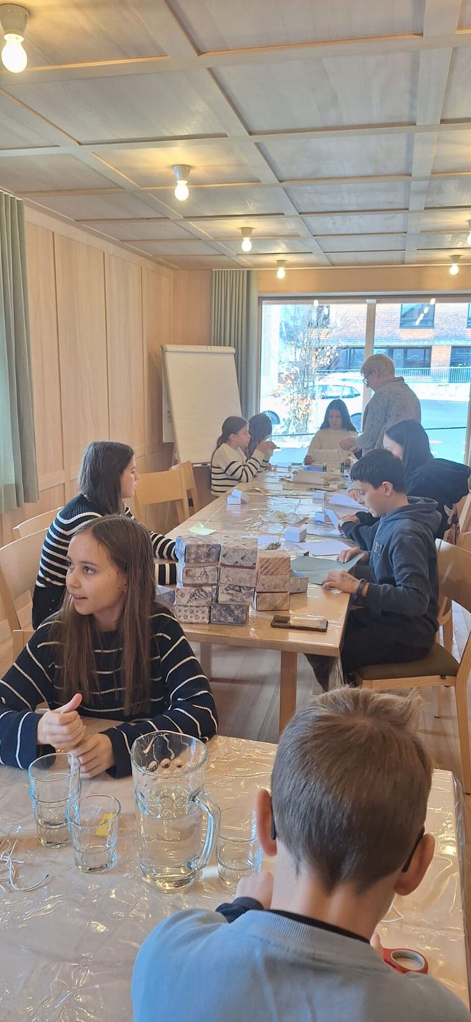 Bei weihnachtlichen Klängen rollten die Kinder aus Bienenwachsplatten fein nach Honig duftende Kerzen und aus geschmolzenem Bienenwachs gossen sie verschiedene Christbaum-Anhänger.
