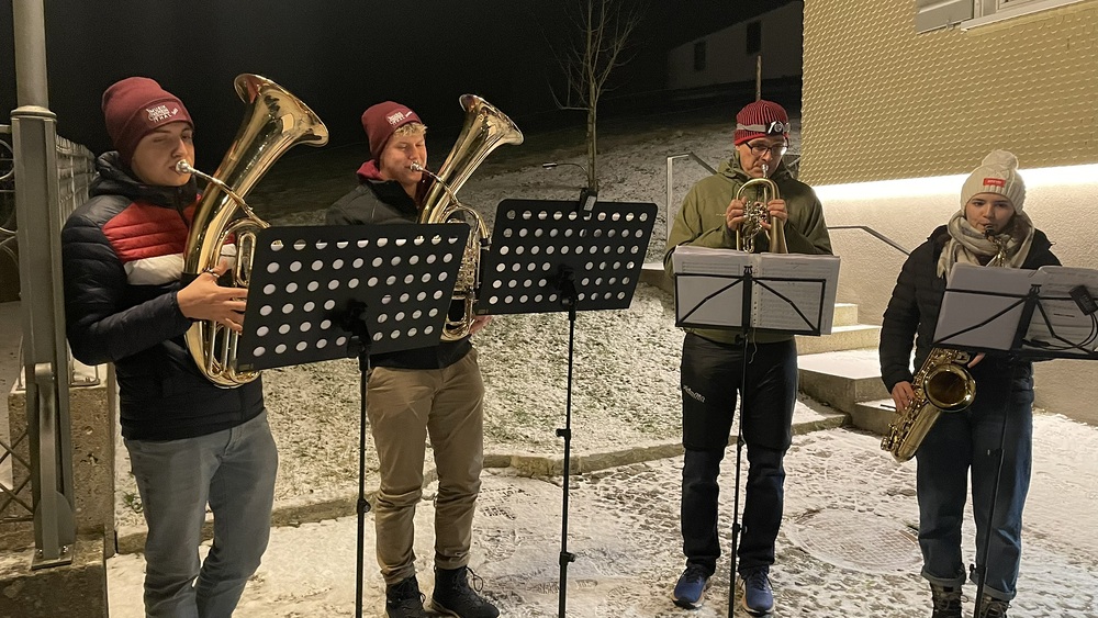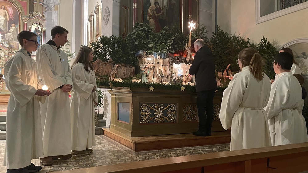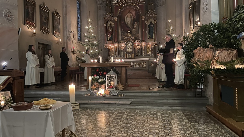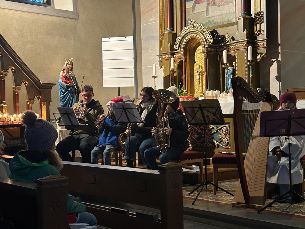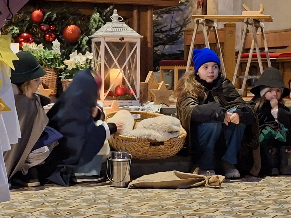 Später am Abend kamen die Erwachsenen zur Wort-Gottes-Feier in der Heiligen Nacht zusammen, die von Theo Lang geleitet wurde. Diese wurde von einem Bläserensemble und Simon an der Orgel musikalisch gestaltetet.