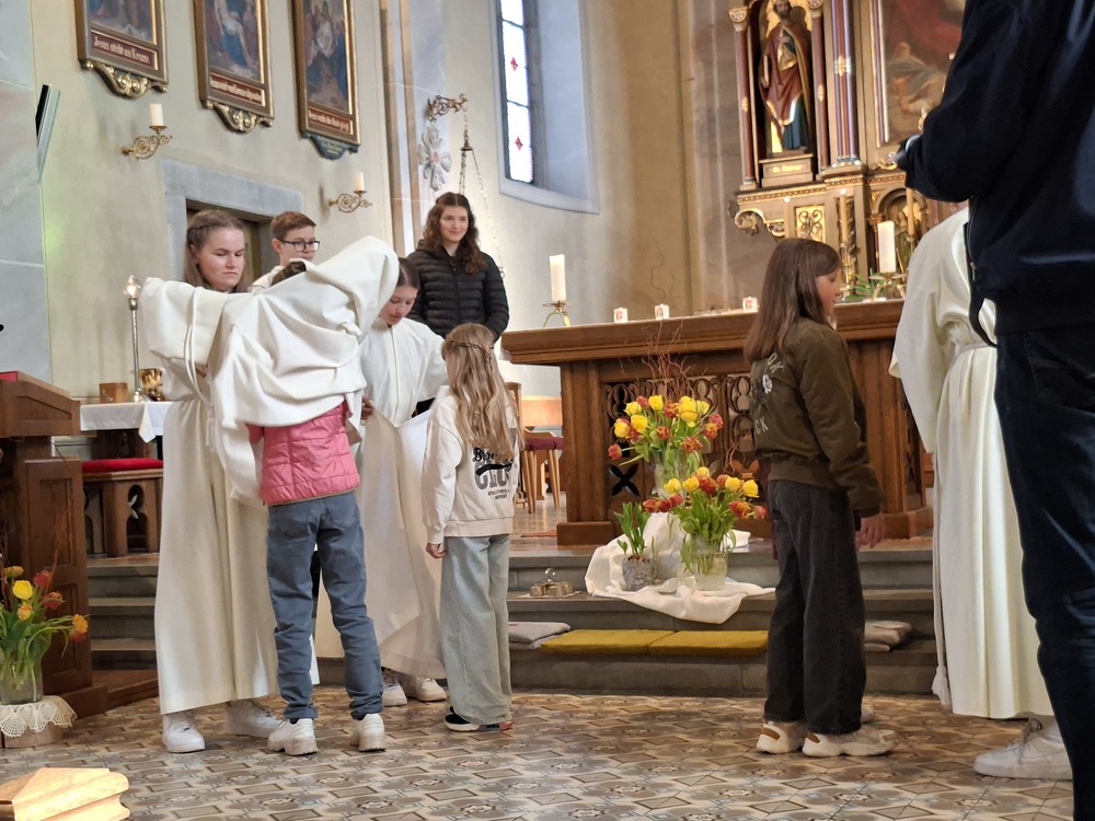 Nachdem die Mädchen ihre Bereitschaft für den Dienst am Altar vor der Gemeinde bekundet hatten, halfen ihnen die größeren Minis beim Einkleiden und Pater Regis sprach ihnen den Segen aus.