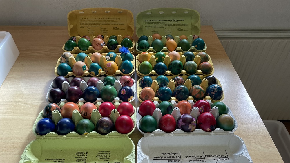 An den lustigen Kreationen erfreuten sich die Messbesucher nach der Osternacht. Denn auch heuer waren nach der Auferstehungsfeier wieder alle zum Osterbock im Pfarrhaus eingeladen, bei dem es die bunten Eier als Nachtjause gab.