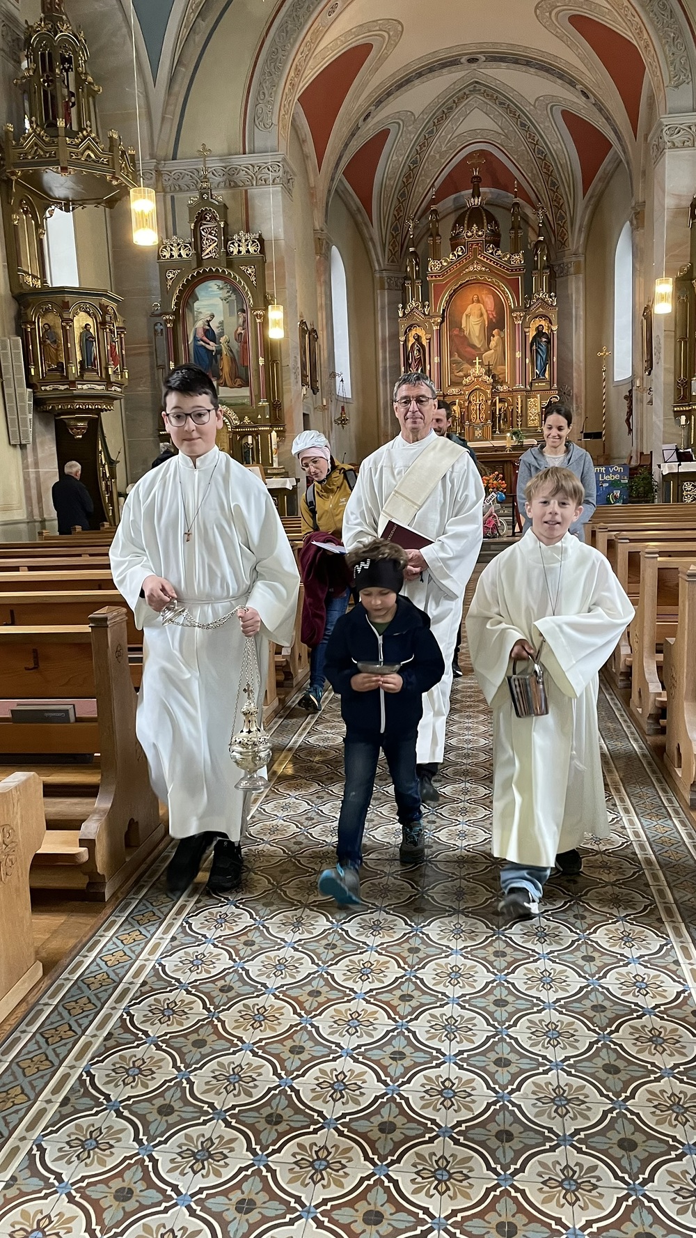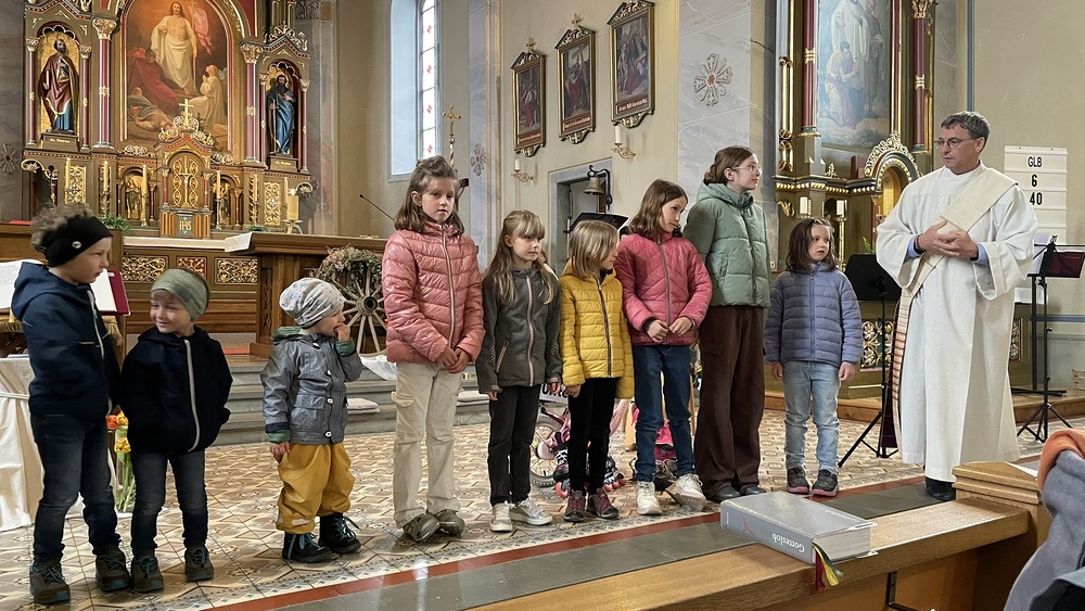 Bei der anschließenden Predigt erinnerte uns Ludwig daran, dass wir Gott zwar nicht sehen, ihn aber bei genauerem Innehalten in vielen kleinen Gesten der Zuwendung in jedem einzelnen Entdecken können, und er somit immer mit uns unterwegs ist. Dies gab er besonders auch den Kindern mit und bestärkte sie in ihrer Einzigartigkeit und Fähigkeit, mit Gott unterwegs zu sein und seine Spuren in die Welt hinauszutragen.