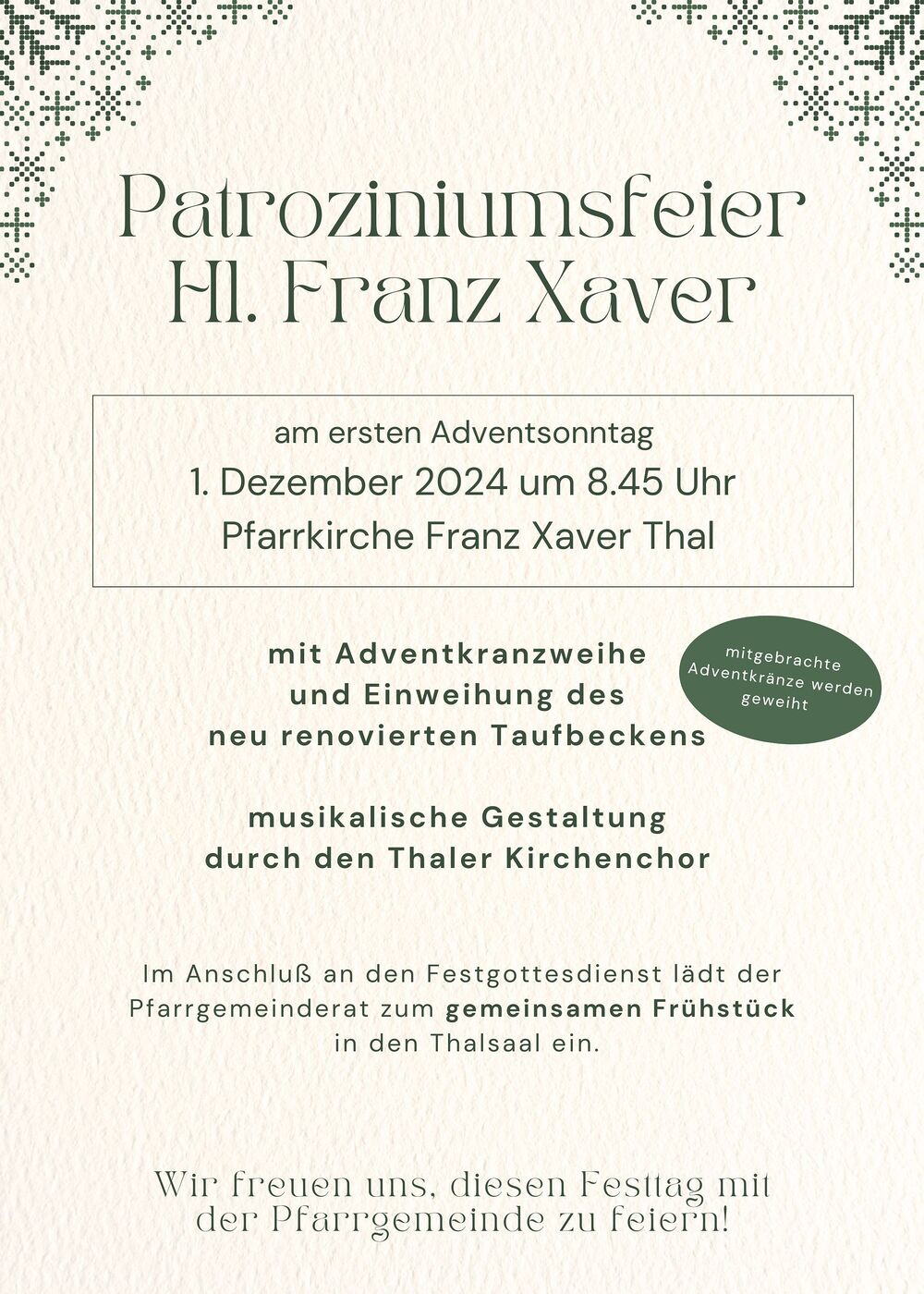 Patrozinium Hl. Franz Xaver - musik. gest. vom Thaler Kirchenchor, anschl. Frühstück im Thalsaal