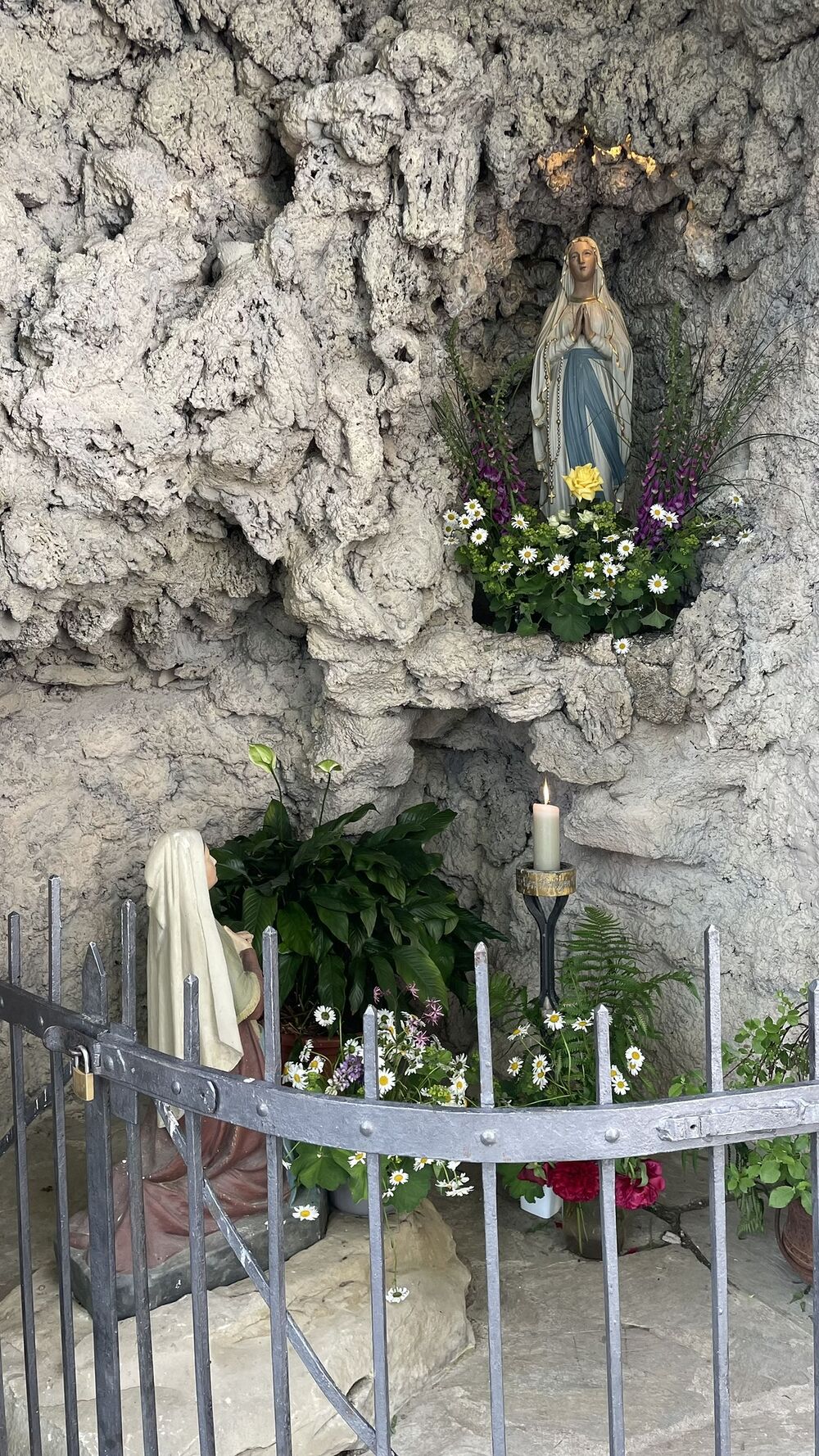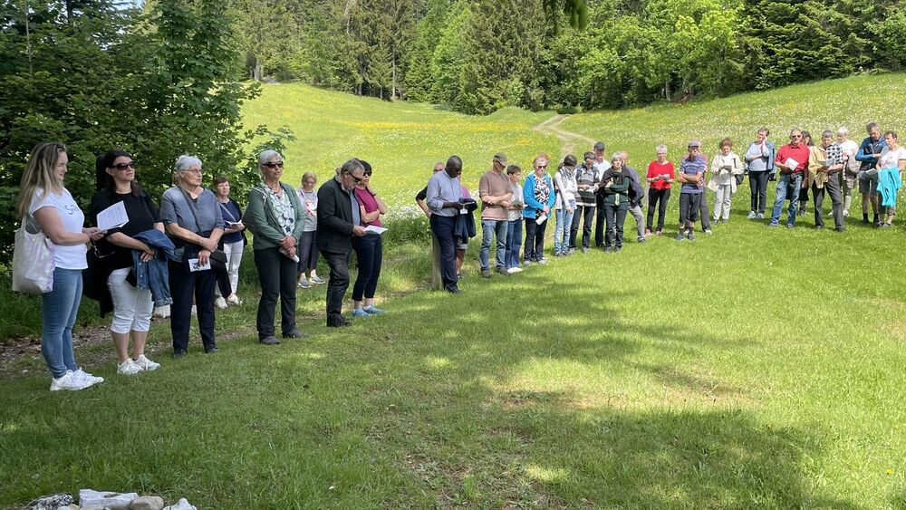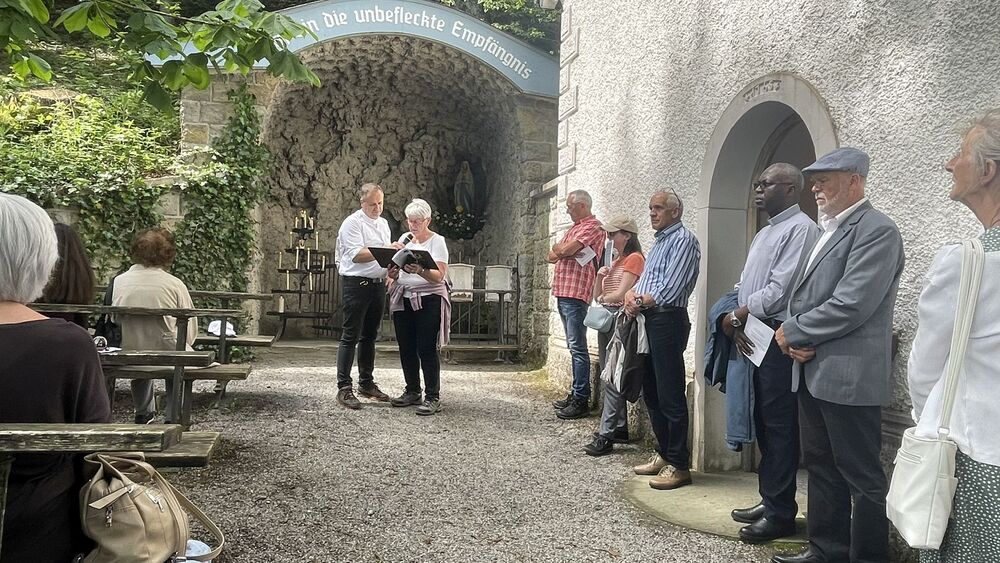 An der Biberacher Höhe genossen wir die wunderschöne Aussicht und machten uns weiter auf den Weg zur Falzkapelle, unserer dritten Station. Wir versammelten uns an der Lourdesgrotte mit ihren schönen Statuen der Hl. Bernadette und Hl. Maria. Im Inneren der schön gepflegten Falzkapelle war die Möglichkeit zum Innehalten und für ein stilles Gebet, bevor wir uns zur letzten Station aufmachten.