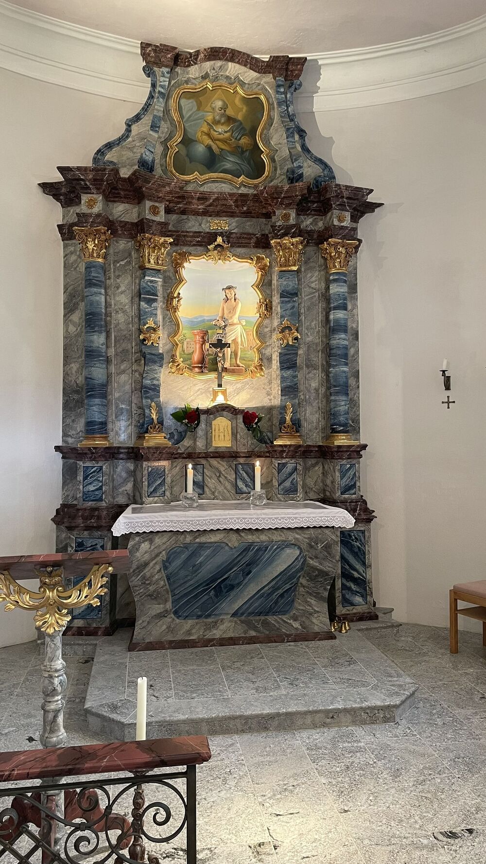In der St. Leonhards Kapelle nahmen wir im Innenraum Platz und hörten einen Text aus der Bibel sowie viel Wissenswertes zur Kapelle. An die Zeit als Wallfahrtskapelle erinnern die Pilgerzeichnungen an den Wänden.