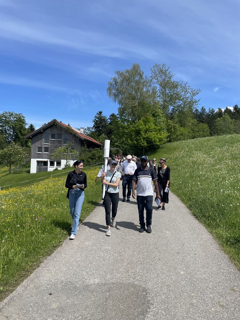 Ausgehend von der Pfarrkirche in Sulzberg führte uns der Weg zur ersten Station bei der St. Antonius Kapelle, wo uns Pfarrmoderator P. Regis Mushunje zunächst den Segen erteilte und wir anschließend Texte zum Hl. Antonius hörten. Wir gingen weiter, beim Moorbad vorbei über einen Feldweg und passierten das „Flatzkreuz“.