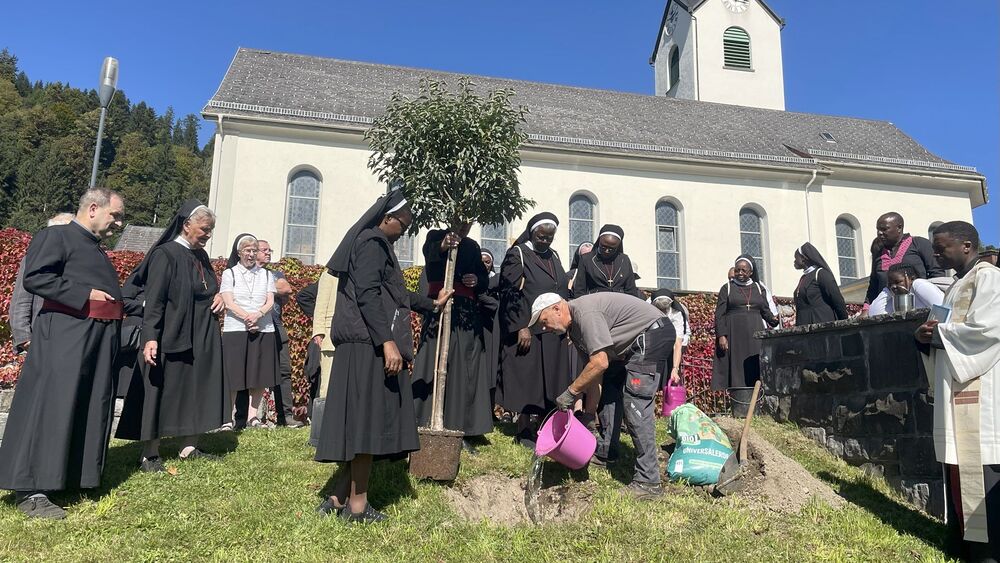 Am Vormittag besuchten die Ordensleute das Geburtshaus des Abtes, wo sie eine kurze Andacht gestalteten. Vor dem Mittagessen kamen sie im Dorfzentrum beim Friedhof zusammen, um gemeinsam als Zeichen der Hoffnung für die Zukunft einen Baum zu pflanzen.